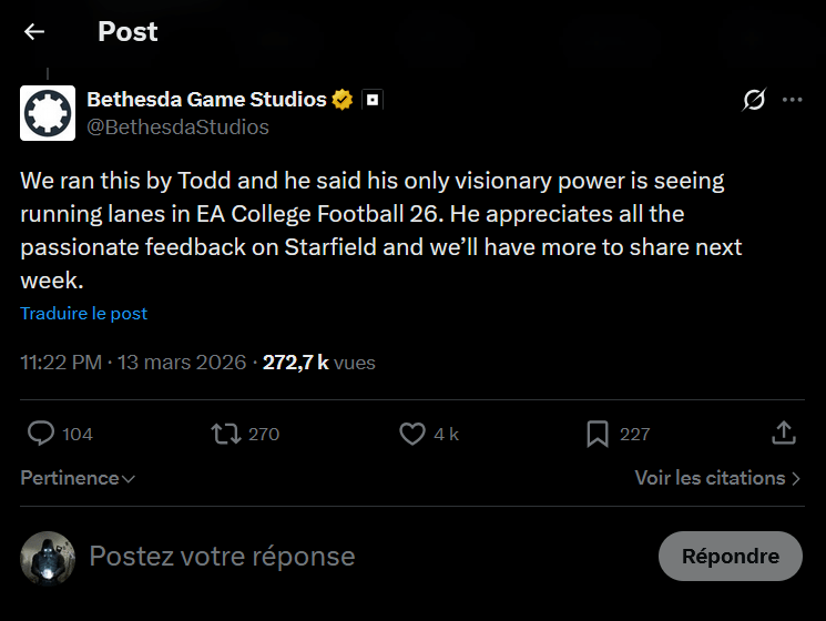 Hier, des créateurs de contenu ont révélé qu’ils ont été invités par Bethesda et on devine aisément en regardant leurs publications sur X qu’ils ont testé les nouveautés à venir de Starfield. Tous ont déclaré qu’ils révéleront bientôt ce qu’ils ont vu. Puis ce fut au tour de Bethesda de communiquer dans une réponse à un tweet : « nous aurons plus d’informations à partager la semaine prochaine. »